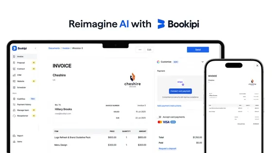 Bookipi partners with Stripe to power the full business workflow: proposals, an AI website builder, invoices, contracts, appointment scheduling, and payments - with AI integrations that simplify and speed up every step.
