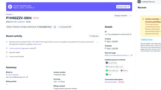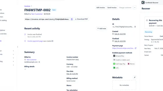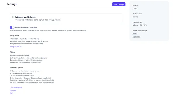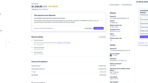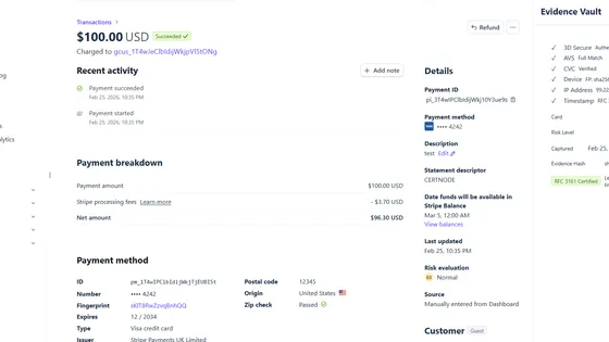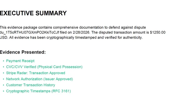 CertNode protects your revenue with three Stripe apps. Evidence Vault captures 3DS, AVS, and device data at payment time with RFC 3161 certified timestamps. Recover saves failed payments with smart retries and psychology-enhanced dunning. Reflex defends chargebacks automatically — AI gathers evidence, writes the defense narrative, and submits to Stripe in 60 seconds. $0/month on everything. You only pay when we deliver results.