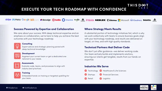 At This Dot Labs, we're dedicated to helping your business create smart, innovative solutions and reach its full potential. We understand that in today's fast-paced tech environment, adaptability and efficiency are crucial. That's why we offer tailored solutions designed to meet your unique challenges and objectives, whether that's growing your team, updating your tech, or helping you launch a new product.