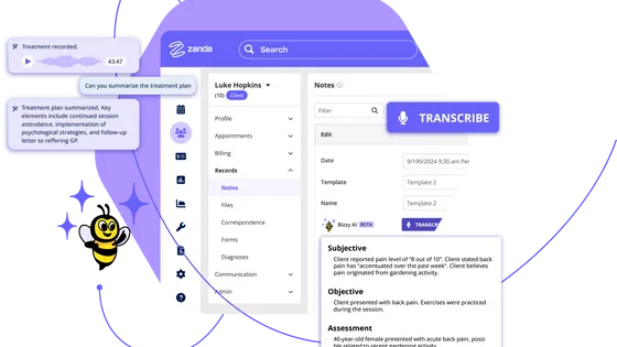 Zanda includes built-in AI tools to help you save time. Transcribe client sessions, write client communications, and gather practice insights - all with the AI tools in Zanda.